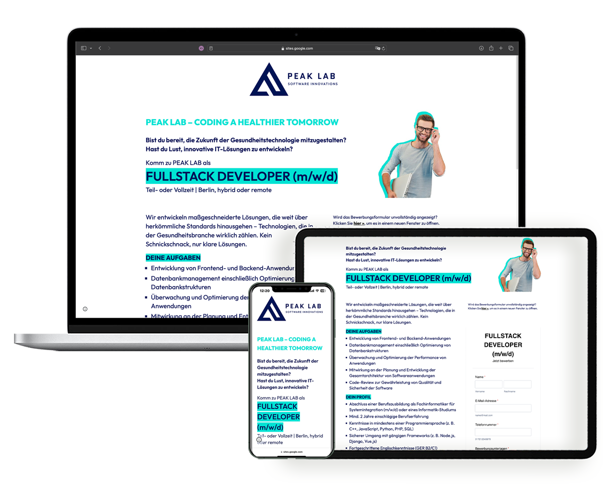 Wir gestalten eine kreative, responsive, suchmaschinenoptimierte Landingpage in deinem Corporate Design, die deine Stellenanzeige perfekt zur Geltung kommen lässt und die Klicks nach oben treibt. Sie erleichtert potentiellen Kandidat:innen den Bewerbungsprozess, sorgt in kürzerer Zeit für mehr Bewerbungen und optimiert ganz nebenbei dein Unternehmensimage.